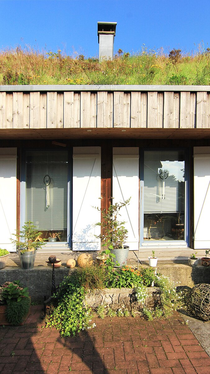 Der Grundriss ist den Bedürfnissen der jungen Familie angepasst. Das Dach wurde begrünt. Ein neben dem Haus angeordneter freier Baukörper dient als Lagerhaus für Gerätschaften, dessen Unterkellerung Raum für die Aufbewahrung von Vorräten birgt.